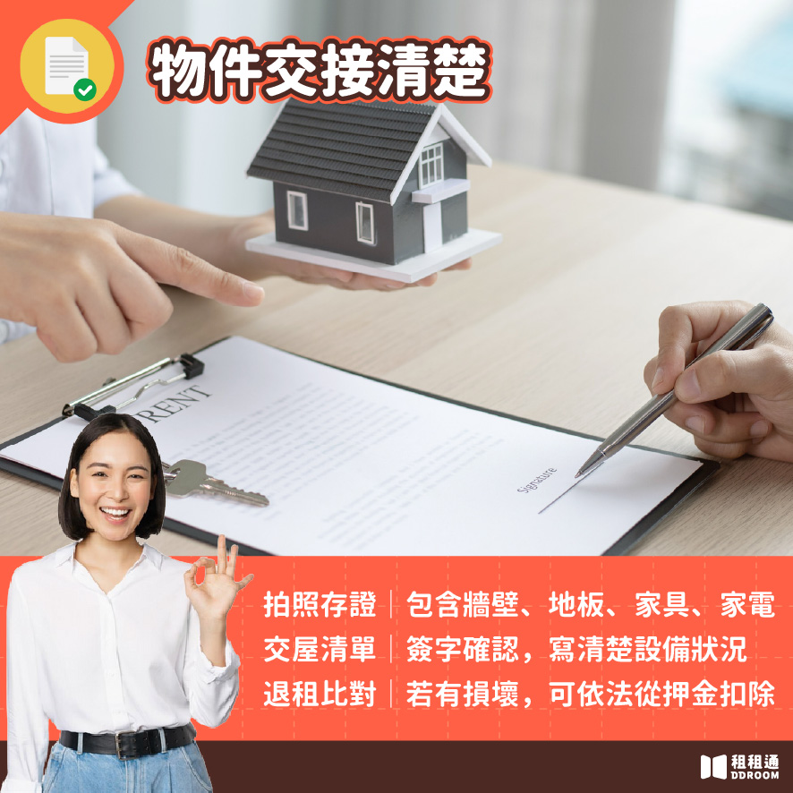 房東應準備一份詳細的房屋交屋清單,逐一核對房屋內的各項設備與物品,並請租客確認。雙方應在清單上註明房屋的現況,例如是否有刮痕、污漬、損壞等,並簽名確認,以避免日後產生爭議。 租屋前就應「點交」清楚,當你在租屋點交時,又有什麼注意事項?點交流程跟點交清單又是什麼呢?